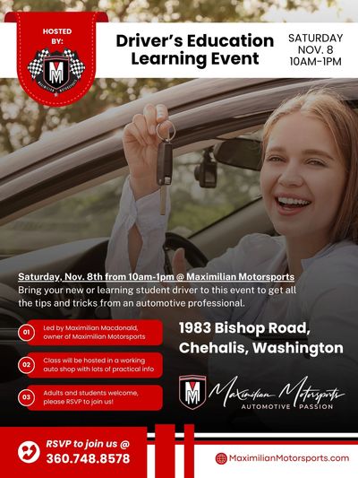 We're hosting another FREE Driver's Education Learning Event at here at Maximilian Motorsports! This is an excellent opportunity for new or soon-to-be drivers to learn more about driving and safety, winter driving, vehicle maintenance, and more. Join us on Saturday, Nov. 8!